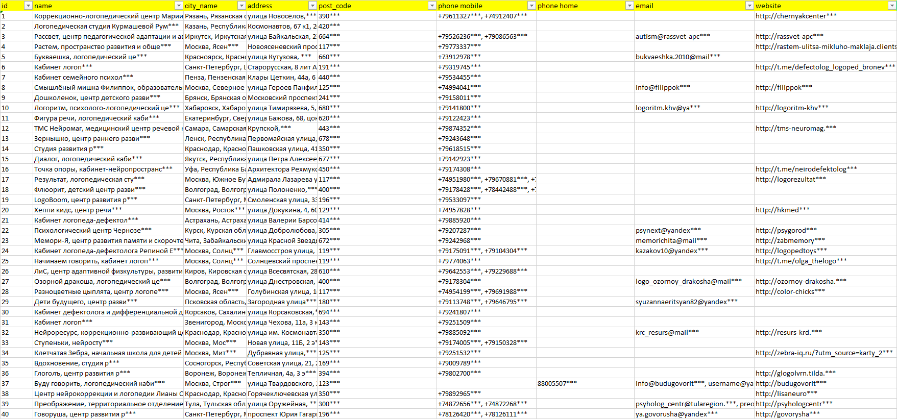База организаций дефектолог, вся Россия в формате Excel с эл. почтами, телефонами, сайтами, ссылками на соц сети, координатами и другой информацией. Скачайте демо версию, чтобы ознакомиться с данными.
