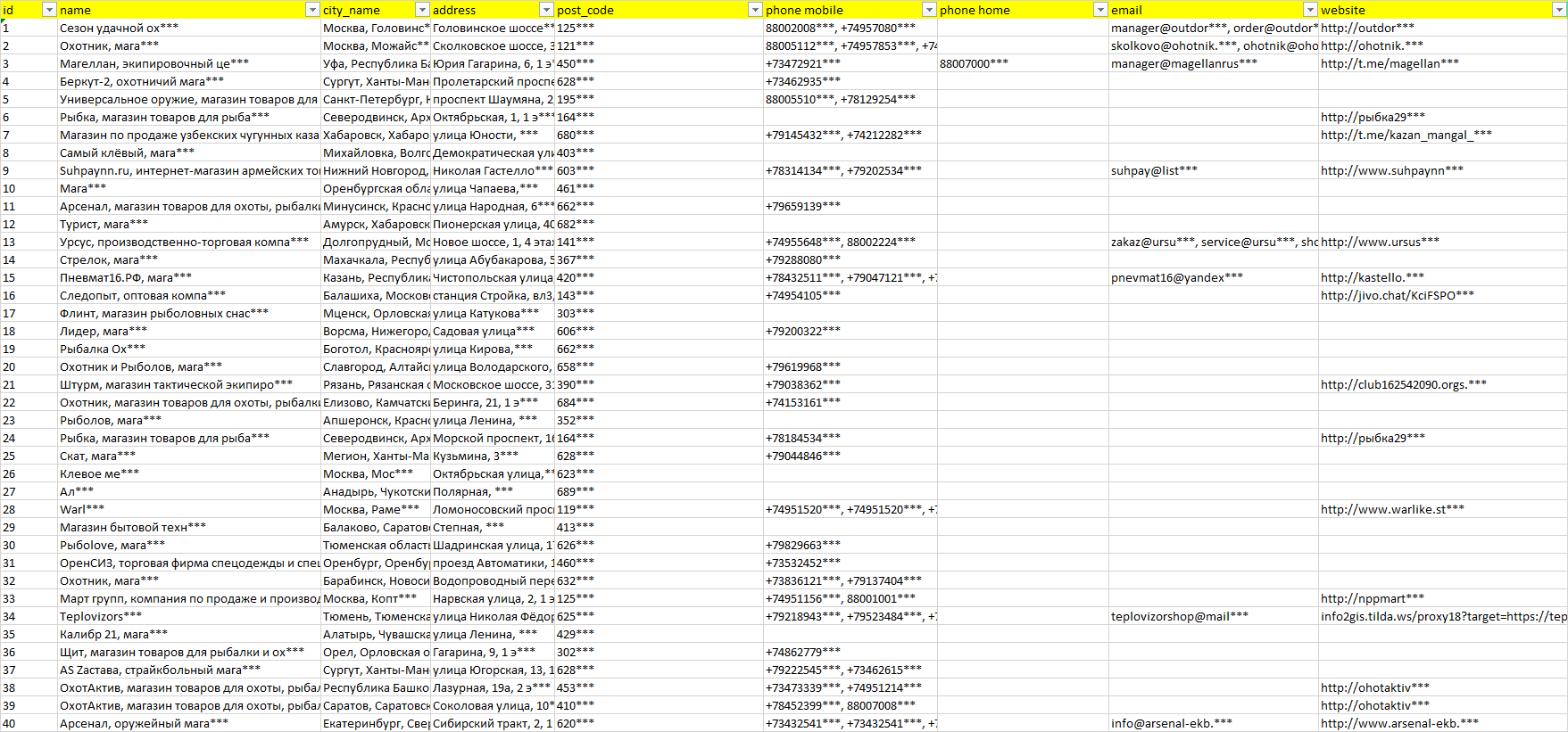 База компаний товары для охоты, вся РФ в формате Excel с эл. почтами, телефонами, сайтами, ссылками на соц сети, координатами и другой информацией. Скачайте демо версию, чтобы ознакомиться с данными.