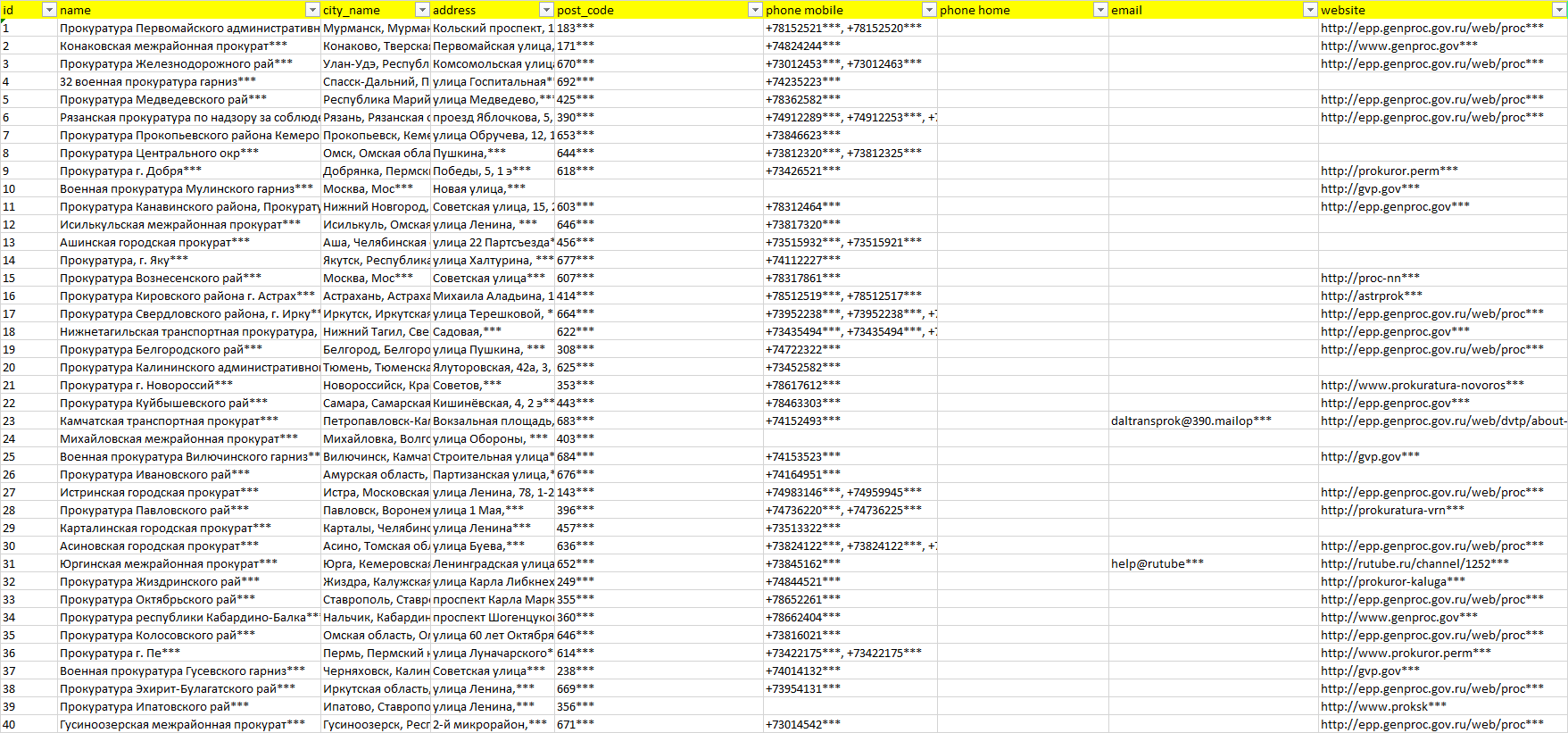 База компаний прокуратура, вся РФ в формате Excel с эл. почтами, телефонами, сайтами, ссылками на соц сети, координатами и другой информацией. Скачайте демо версию, чтобы ознакомиться с данными.