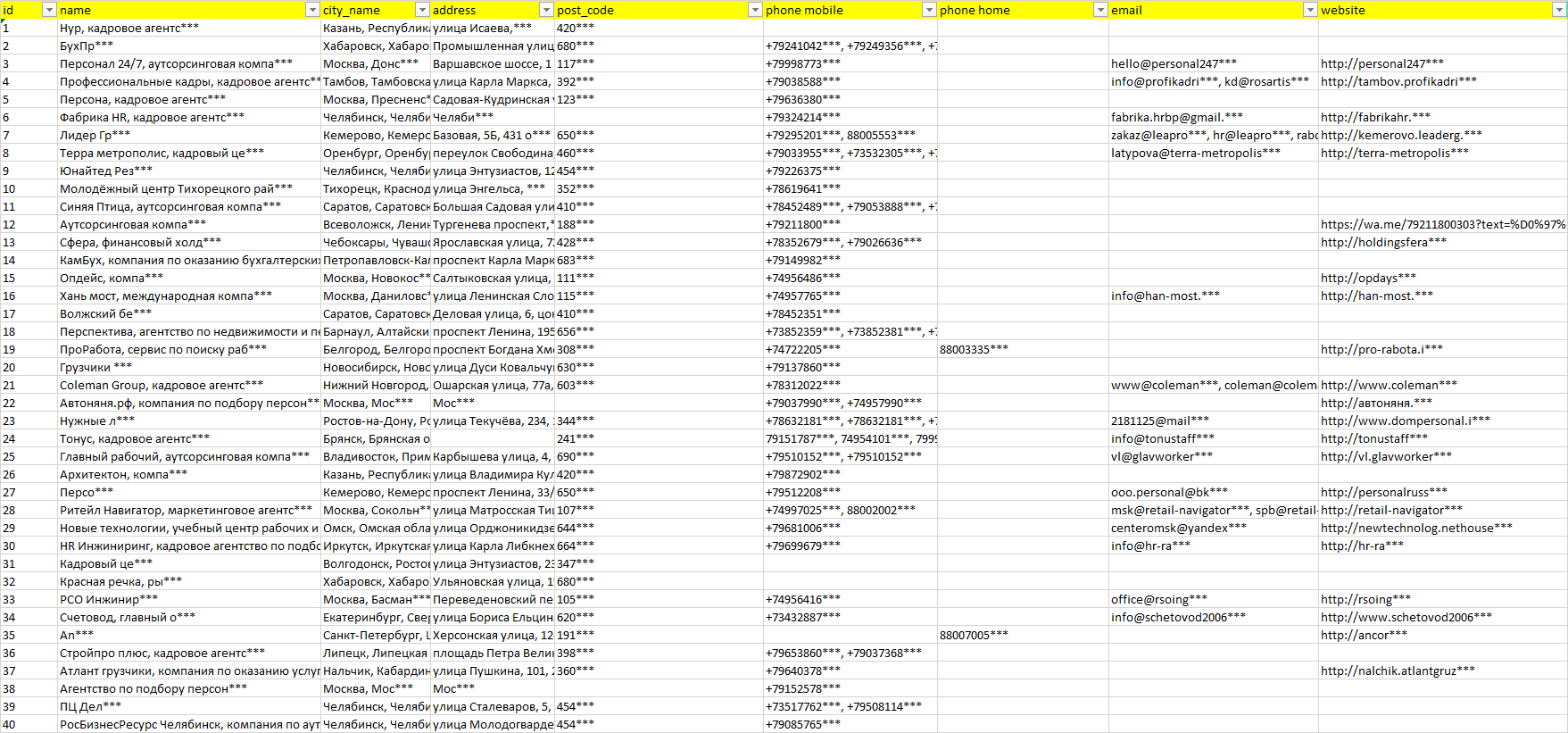 База компаний кадровые агентства, вся РФ в формате Excel с эл. почтами, телефонами, сайтами, ссылками на соц сети, координатами и другой информацией. Скачайте демо версию, чтобы ознакомиться с данными.