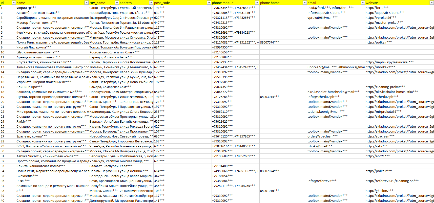 База компаний прокат клинингового оборудования, вся РФ в формате Excel с эл. почтами, телефонами, сайтами, ссылками на соц сети, координатами и другой информацией. Скачайте демо версию, чтобы ознакомиться с данными.