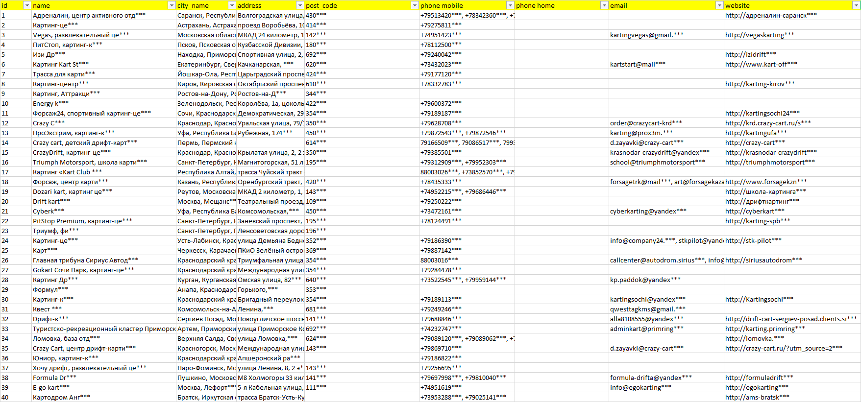База компаний картинг, вся РФ в формате Excel с эл. почтами, телефонами, сайтами, ссылками на соц сети, координатами и другой информацией. Скачайте демо версию, чтобы ознакомиться с данными.