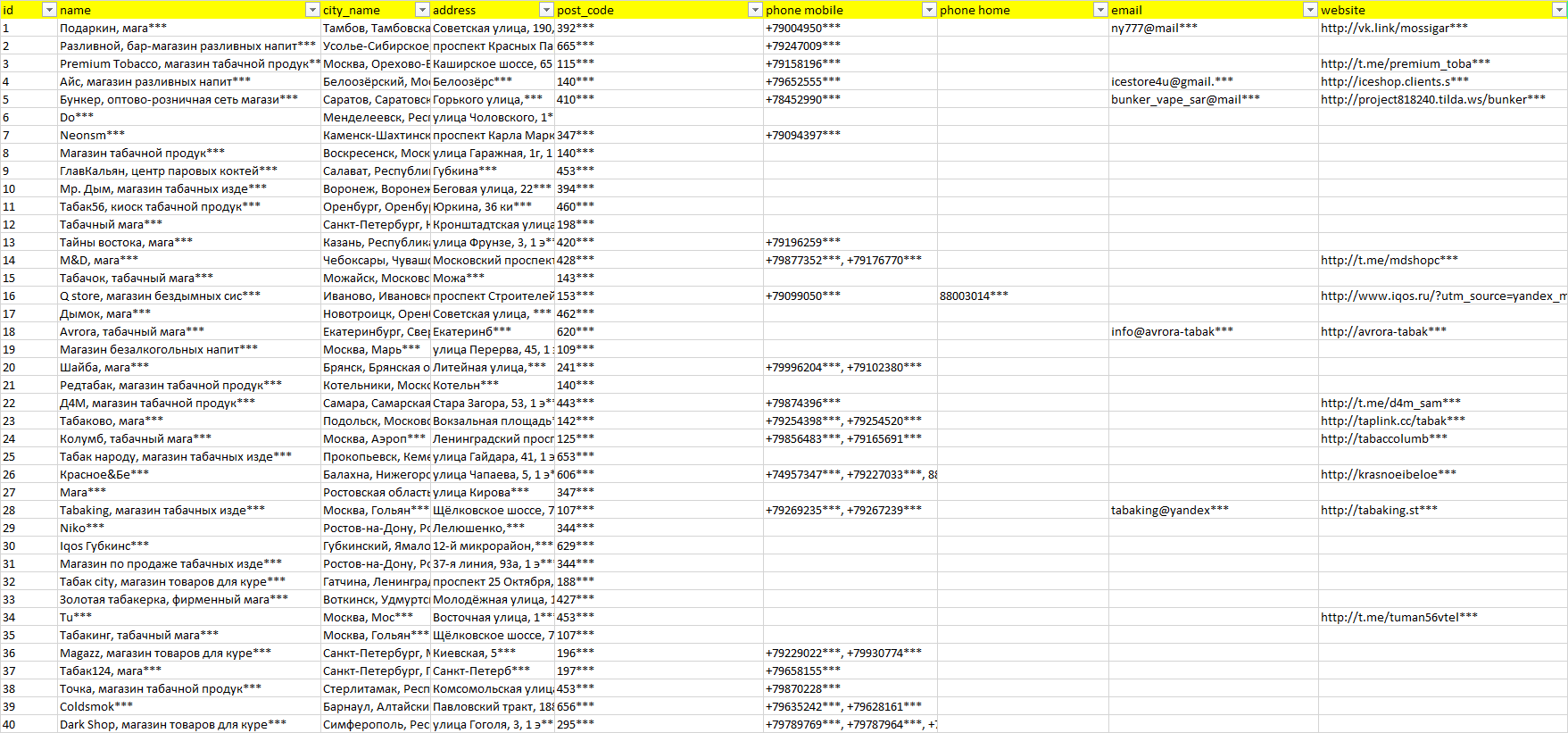 База организаций электронные сигареты, вся Россия в формате Excel с эл. почтами, телефонами, сайтами, ссылками на соц сети, координатами и другой информацией. Скачайте демо версию, чтобы ознакомиться с данными.