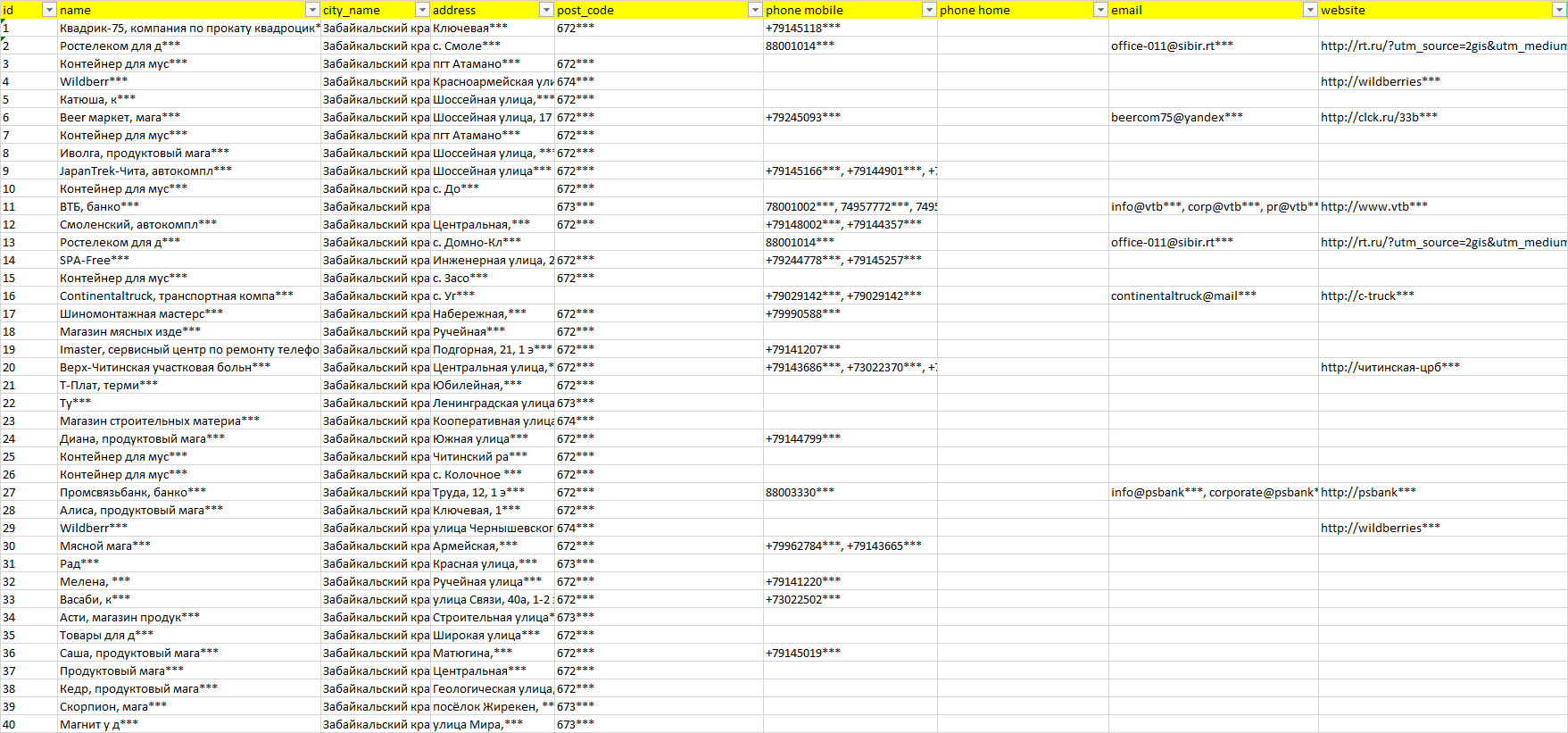 База организаций Забайкальский край, вся Россия в формате Excel с эл. почтами, телефонами, сайтами, ссылками на соц сети, координатами и другой информацией. Скачайте демо версию, чтобы ознакомиться с данными.