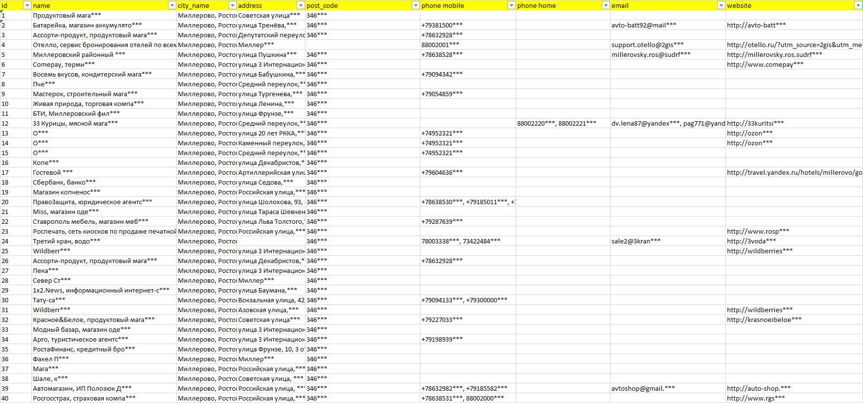База компаний Миллерово, вся РФ в формате Excel с эл. почтами, телефонами, сайтами, ссылками на соц сети, координатами и другой информацией. Скачайте демо версию, чтобы ознакомиться с данными.