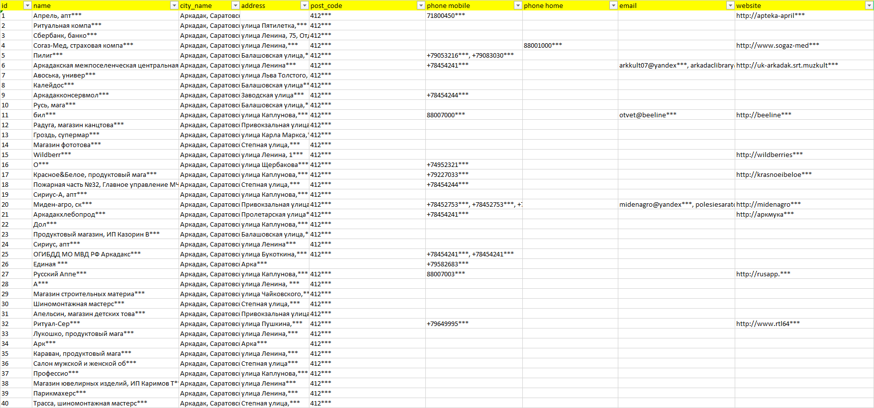 База организаций Аркадак, вся Россия в формате Excel с эл. почтами, телефонами, сайтами, ссылками на соц сети, координатами и другой информацией. Скачайте демо версию, чтобы ознакомиться с данными.
