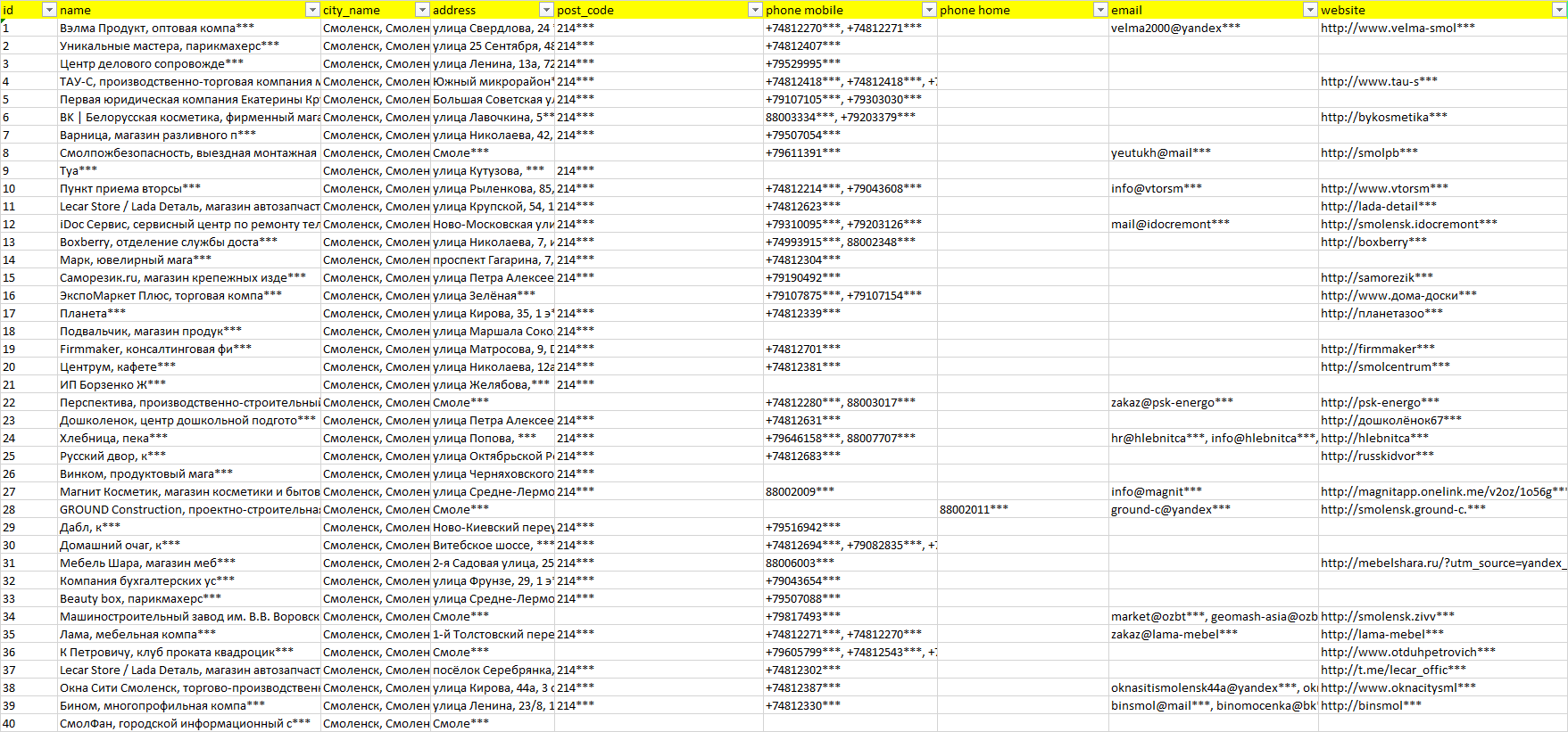База компаний Смоленск, вся РФ в формате Excel с эл. почтами, телефонами, сайтами, ссылками на соц сети, координатами и другой информацией. Скачайте демо версию, чтобы ознакомиться с данными.