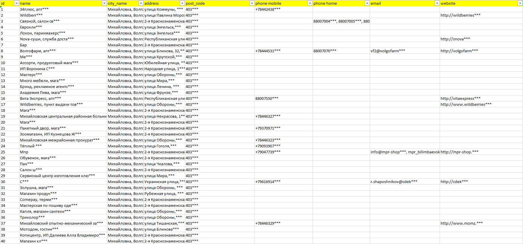 База компаний Михайловка, вся РФ в формате Excel с эл. почтами, телефонами, сайтами, ссылками на соц сети, координатами и другой информацией. Скачайте демо версию, чтобы ознакомиться с данными.