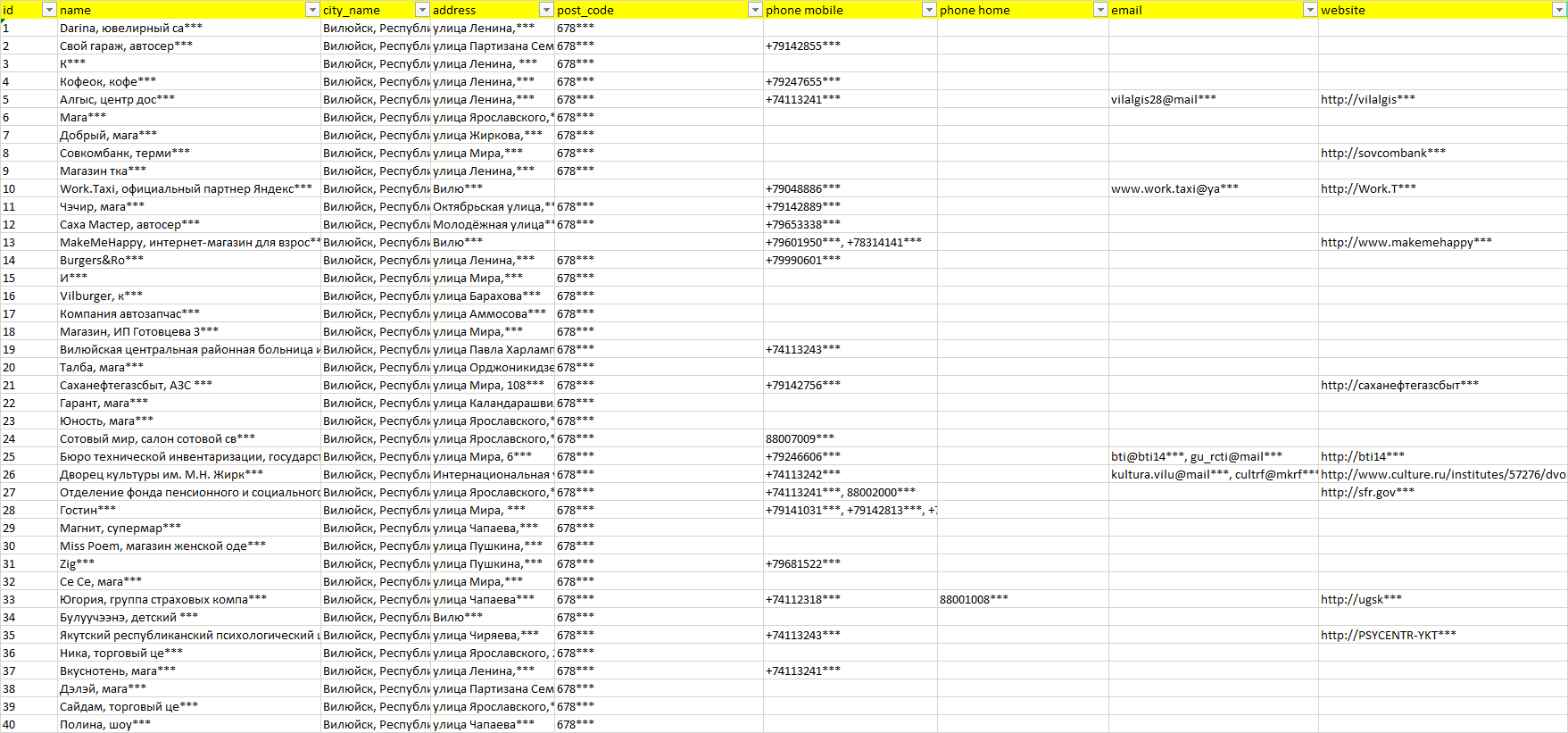 База организаций Вилюйск, вся Россия в формате Excel с эл. почтами, телефонами, сайтами, ссылками на соц сети, координатами и другой информацией. Скачайте демо версию, чтобы ознакомиться с данными.