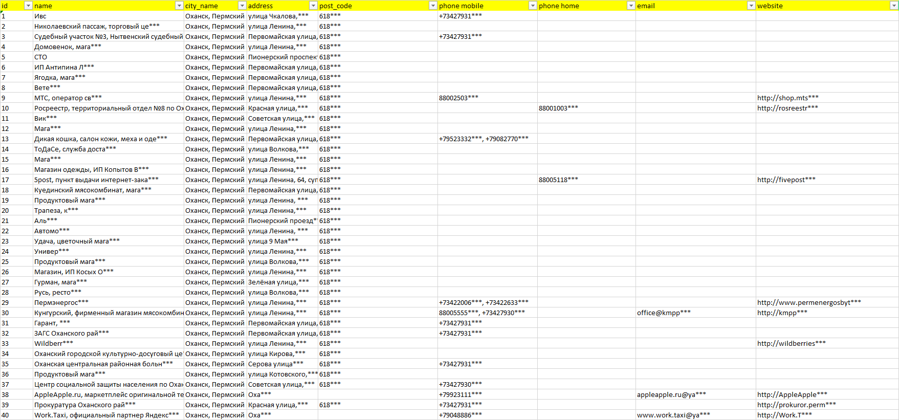 База компаний Оханск, вся РФ в формате Excel с эл. почтами, телефонами, сайтами, ссылками на соц сети, координатами и другой информацией. Скачайте демо версию, чтобы ознакомиться с данными.