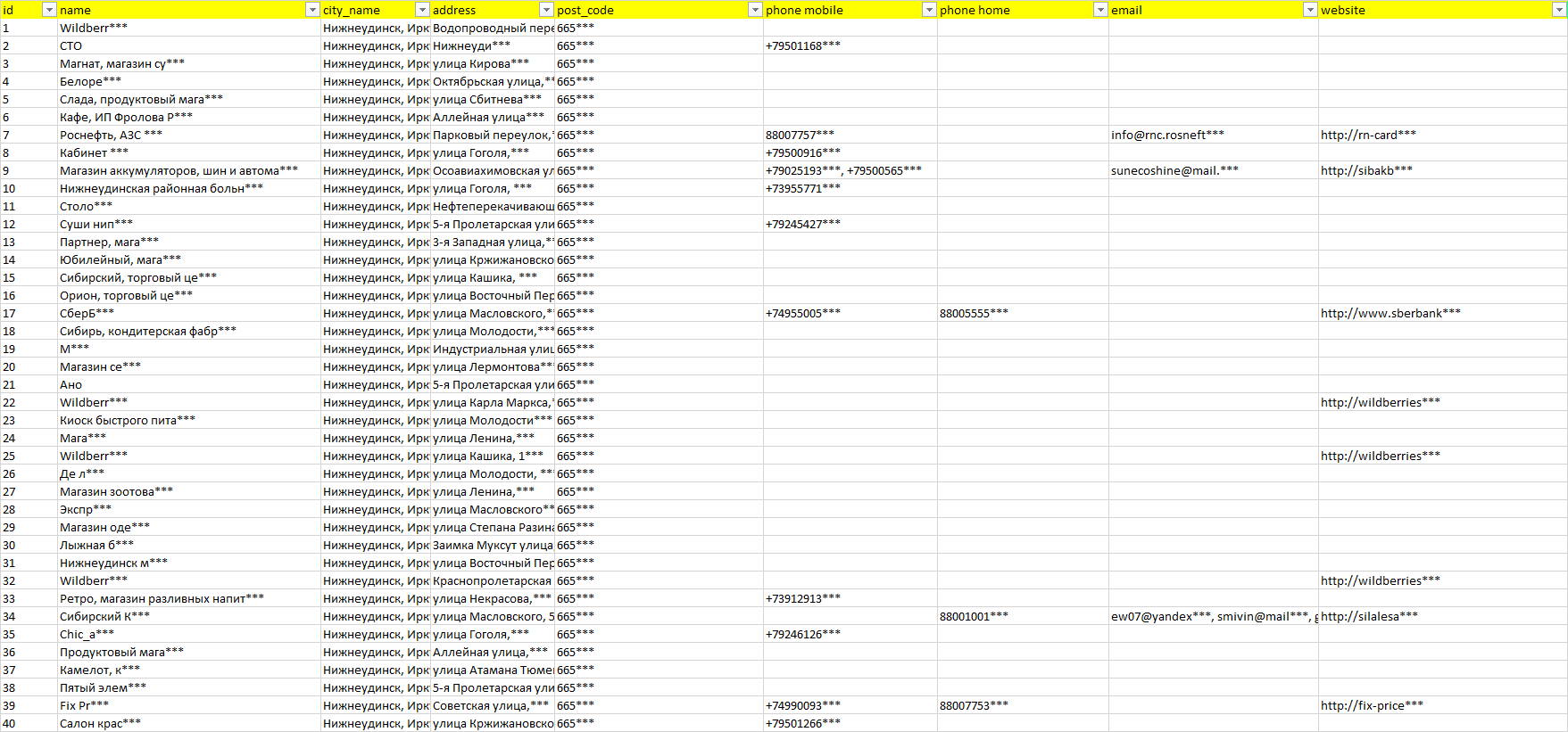 База организаций Нижнеудинск, вся Россия в формате Excel с эл. почтами, телефонами, сайтами, ссылками на соц сети, координатами и другой информацией. Скачайте демо версию, чтобы ознакомиться с данными.