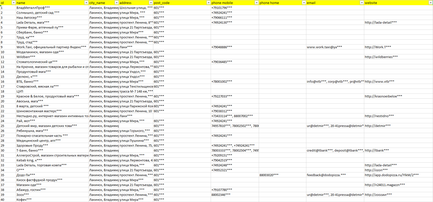 База компаний Лакинск, вся РФ в формате Excel с эл. почтами, телефонами, сайтами, ссылками на соц сети, координатами и другой информацией. Скачайте демо версию, чтобы ознакомиться с данными.