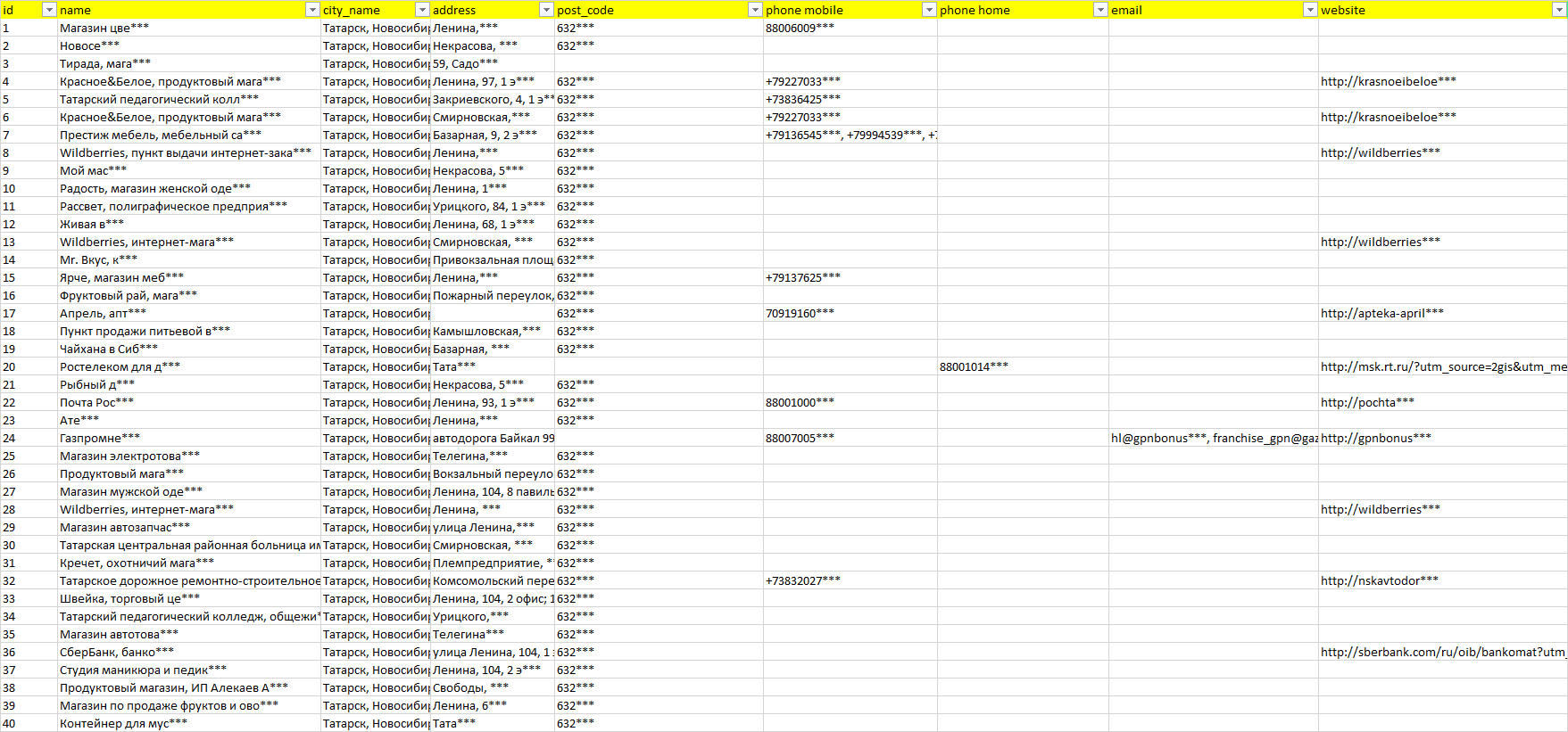 База организаций Татарск, вся Россия в формате Excel с эл. почтами, телефонами, сайтами, ссылками на соц сети, координатами и другой информацией. Скачайте демо версию, чтобы ознакомиться с данными.