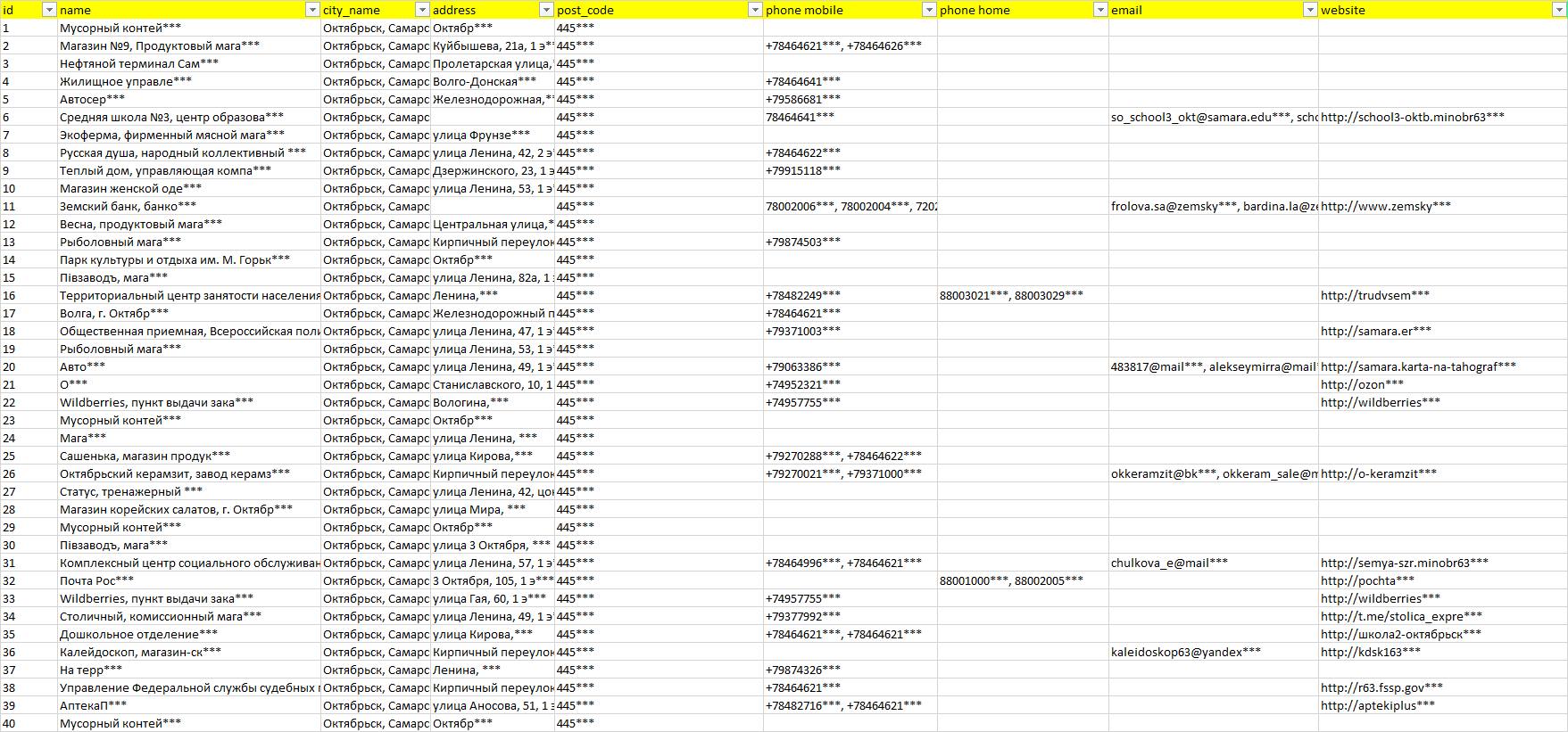 База организаций Октябрьск, вся Россия в формате Excel с эл. почтами, телефонами, сайтами, ссылками на соц сети, координатами и другой информацией. Скачайте демо версию, чтобы ознакомиться с данными.