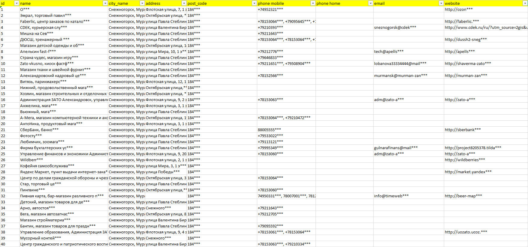 База компаний Снежногорск, вся РФ в формате Excel с эл. почтами, телефонами, сайтами, ссылками на соц сети, координатами и другой информацией. Скачайте демо версию, чтобы ознакомиться с данными.