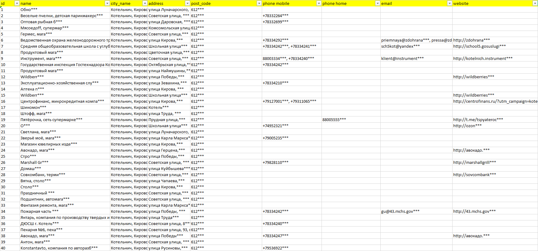 База организаций Котельнич, вся Россия в формате Excel с эл. почтами, телефонами, сайтами, ссылками на соц сети, координатами и другой информацией. Скачайте демо версию, чтобы ознакомиться с данными.
