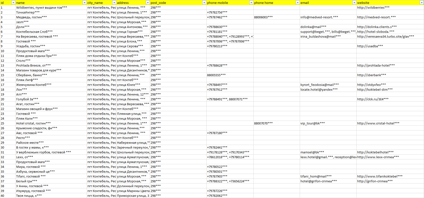 База компаний пгт Коктебель, вся РФ в формате Excel с эл. почтами, телефонами, сайтами, ссылками на соц сети, координатами и другой информацией. Скачайте демо версию, чтобы ознакомиться с данными.