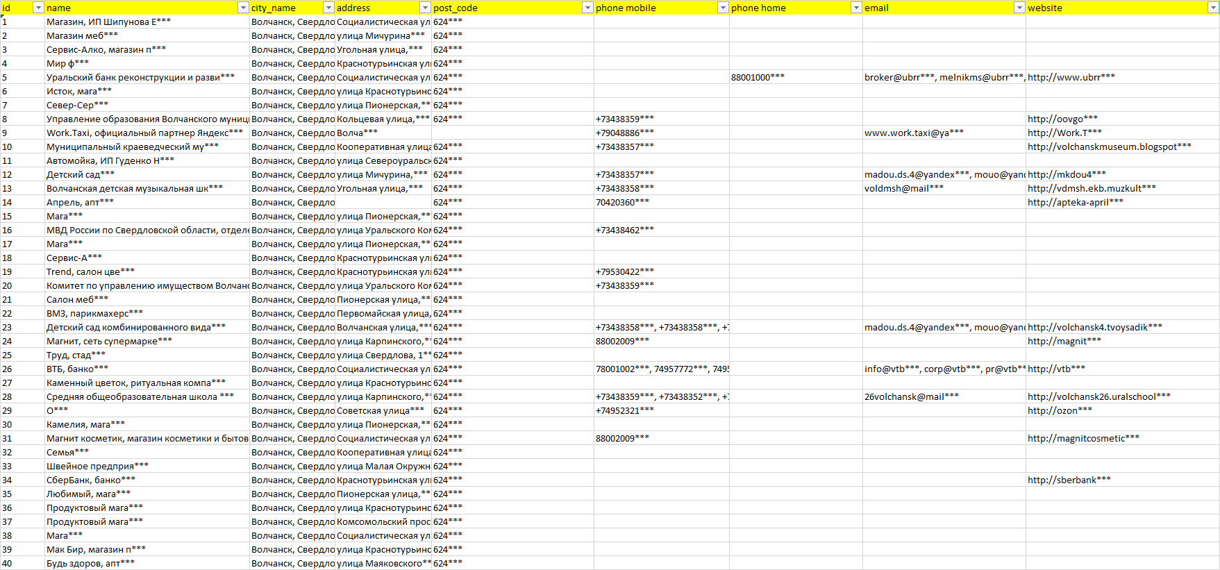 База компаний Волчанск, вся РФ в формате Excel с эл. почтами, телефонами, сайтами, ссылками на соц сети, координатами и другой информацией. Скачайте демо версию, чтобы ознакомиться с данными.