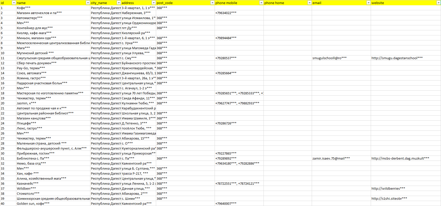 База компаний Республика Дагестан, вся РФ в формате Excel с эл. почтами, телефонами, сайтами, ссылками на соц сети, координатами и другой информацией. Скачайте демо версию, чтобы ознакомиться с данными.