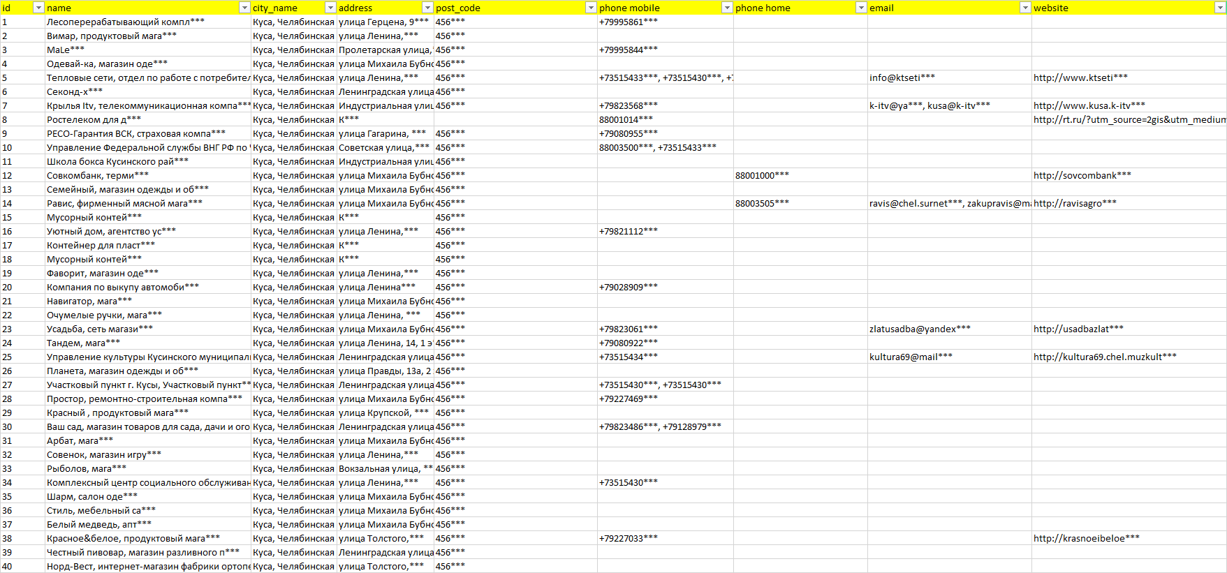 База компаний Куса, вся РФ в формате Excel с эл. почтами, телефонами, сайтами, ссылками на соц сети, координатами и другой информацией. Скачайте демо версию, чтобы ознакомиться с данными.