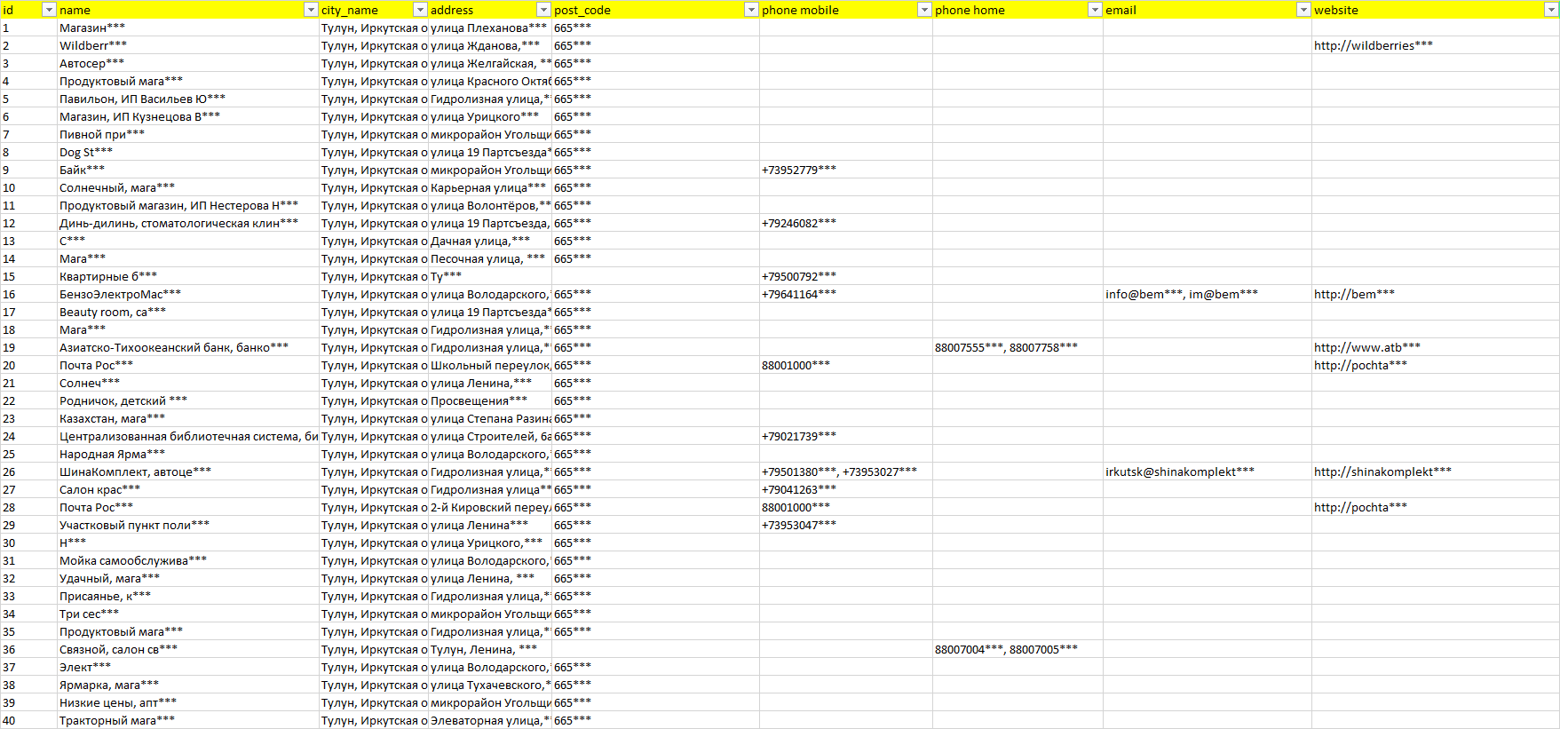 База компаний Тулун, вся РФ в формате Excel с эл. почтами, телефонами, сайтами, ссылками на соц сети, координатами и другой информацией. Скачайте демо версию, чтобы ознакомиться с данными.