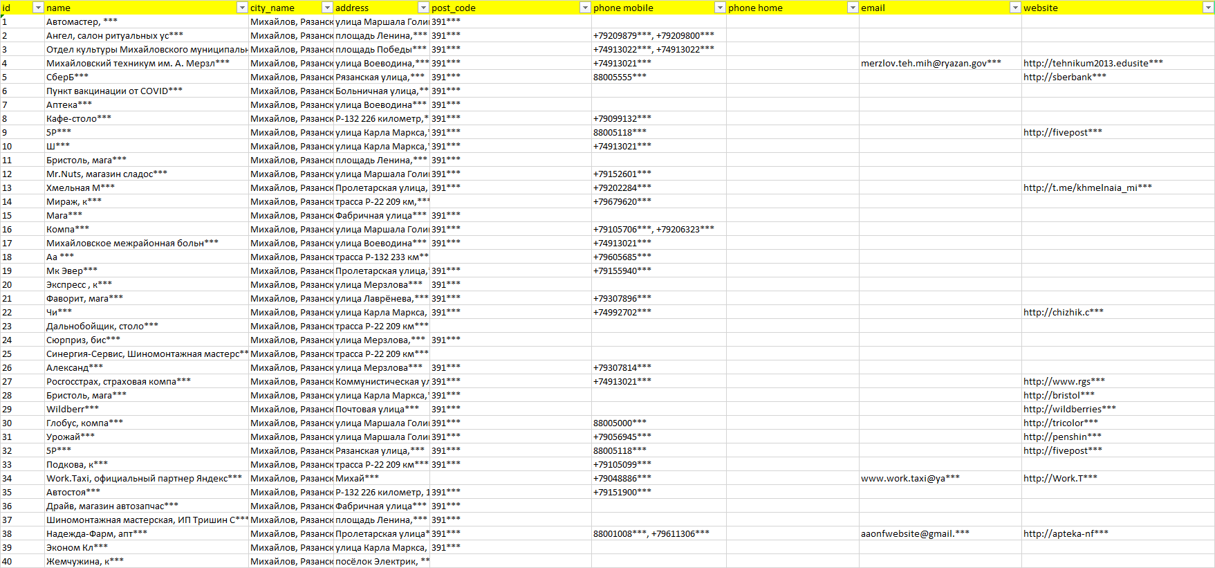 База организаций Михайлов, вся Россия в формате Excel с эл. почтами, телефонами, сайтами, ссылками на соц сети, координатами и другой информацией. Скачайте демо версию, чтобы ознакомиться с данными.