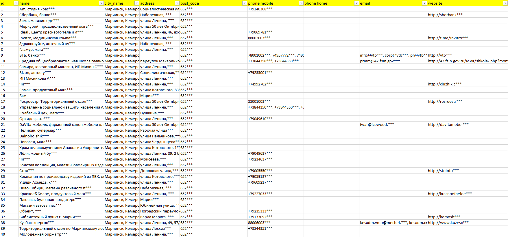 База компаний Мариинск, вся РФ в формате Excel с эл. почтами, телефонами, сайтами, ссылками на соц сети, координатами и другой информацией. Скачайте демо версию, чтобы ознакомиться с данными.