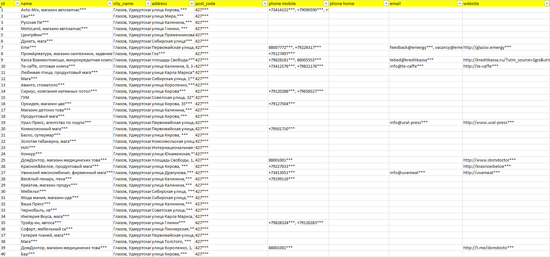 База организаций Глазов, вся Россия в формате Excel с эл. почтами, телефонами, сайтами, ссылками на соц сети, координатами и другой информацией. Скачайте демо версию, чтобы ознакомиться с данными.