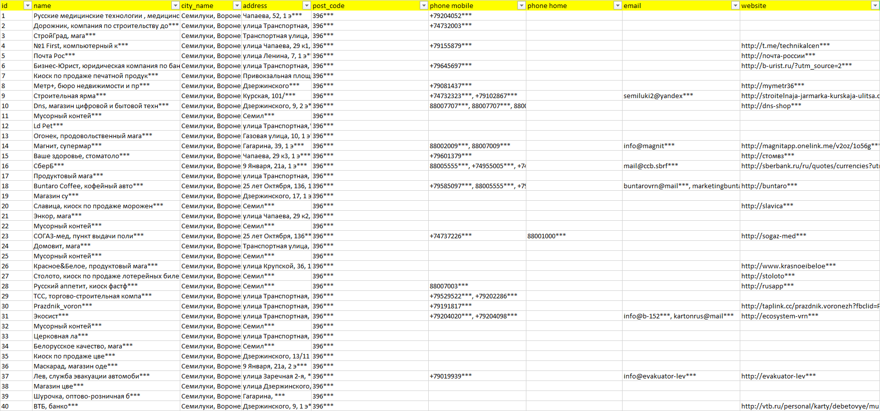 Мы автоматически собираем такие данные с различных открытых источников, обрабатываем, структурирует и упорядочиваем их, предоставляя пользователю возможность скачать результат в формате Excel. По принципу работы наш сервис аналогичен поисковым системам, таким как Google или Яндекс, но с возможностью экспорта найденной информации в удобном табличном виде.