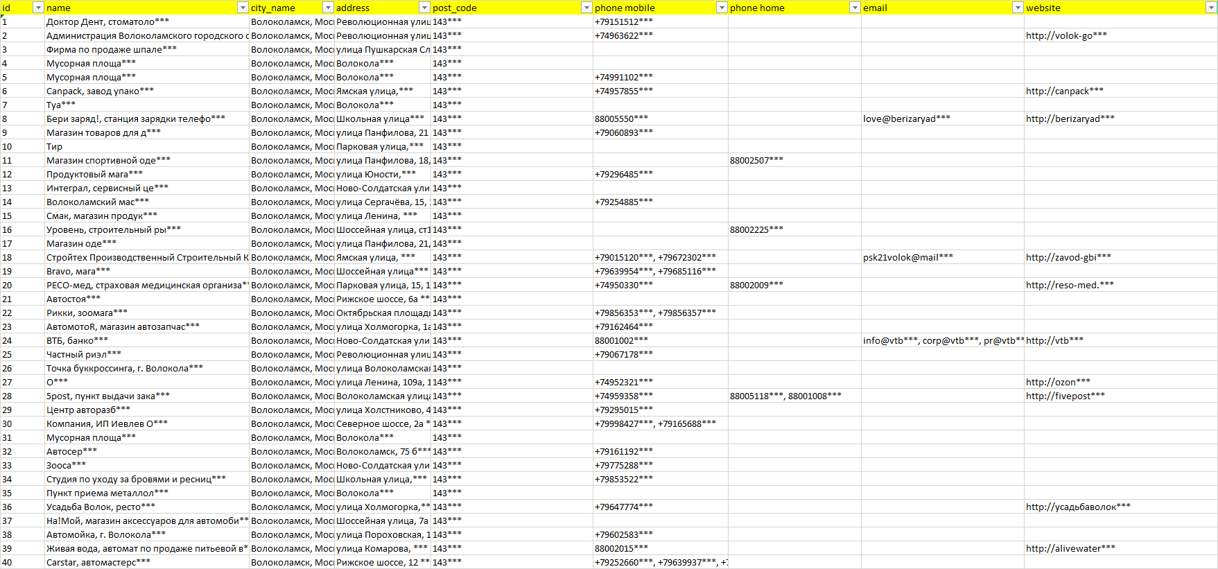 База организаций Волоколамск, вся Россия в формате Excel с эл. почтами, телефонами, сайтами, ссылками на соц сети, координатами и другой информацией. Скачайте демо версию, чтобы ознакомиться с данными.