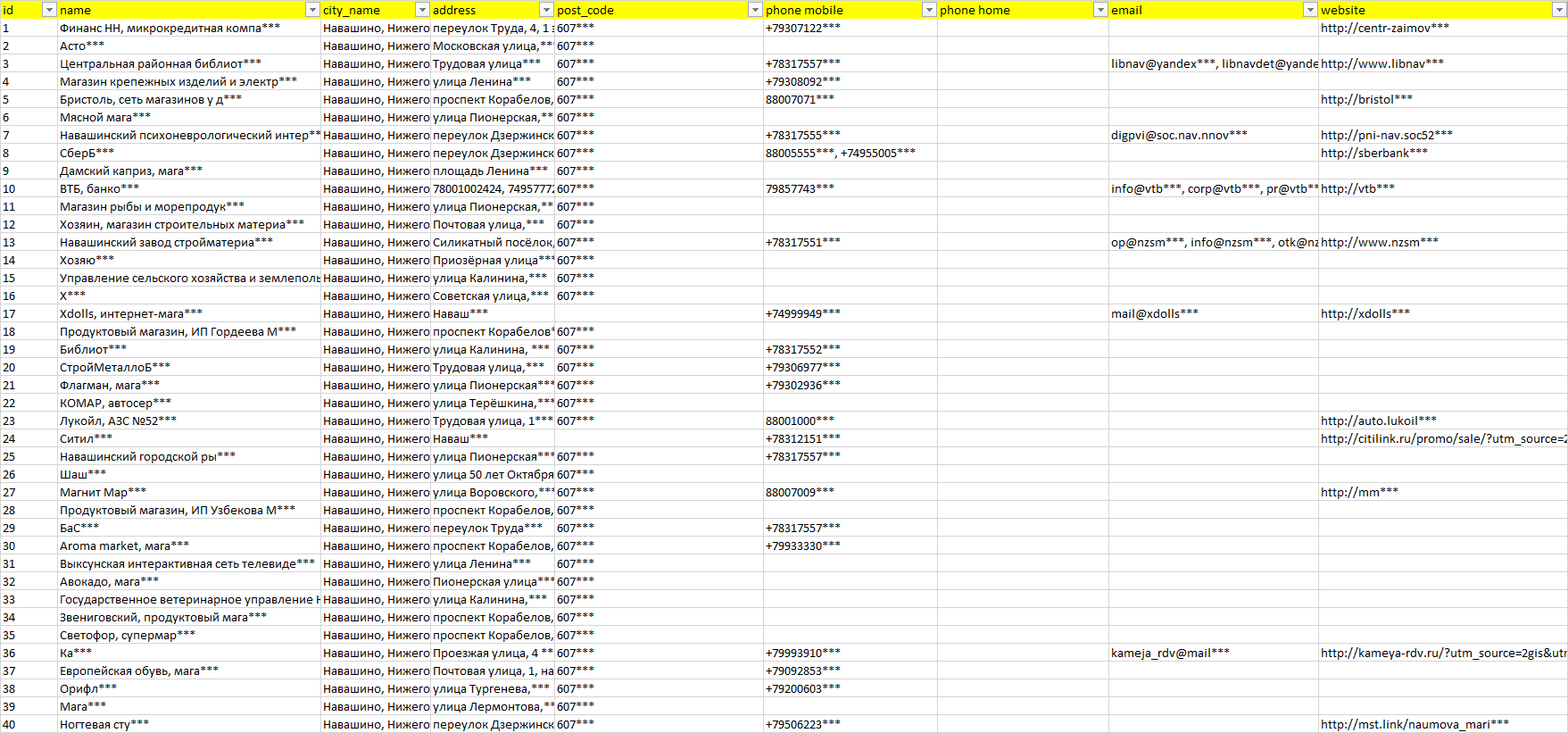 База организаций Навашино, вся Россия в формате Excel с эл. почтами, телефонами, сайтами, ссылками на соц сети, координатами и другой информацией. Скачайте демо версию, чтобы ознакомиться с данными.