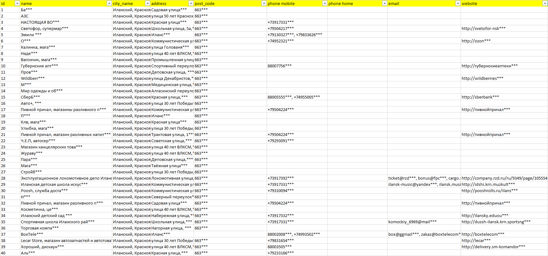 База организаций Иланский, вся Россия в формате Excel с эл. почтами, телефонами, сайтами, ссылками на соц сети, координатами и другой информацией. Скачайте демо версию, чтобы ознакомиться с данными.