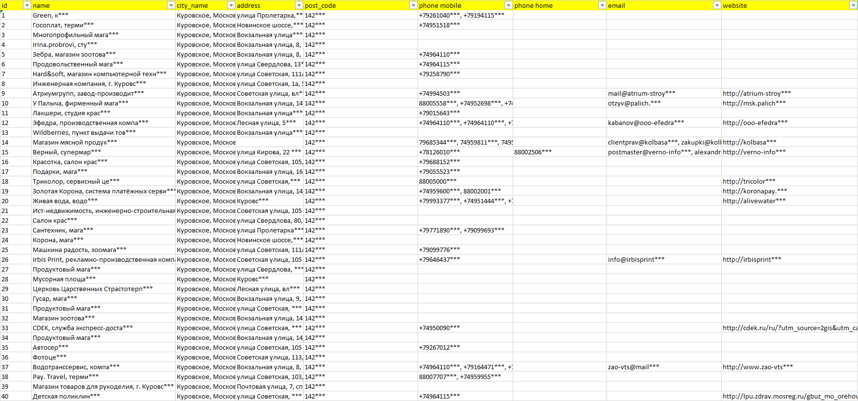База организаций Куровское, вся Россия в формате Excel с эл. почтами, телефонами, сайтами, ссылками на соц сети, координатами и другой информацией. Скачайте демо версию, чтобы ознакомиться с данными.