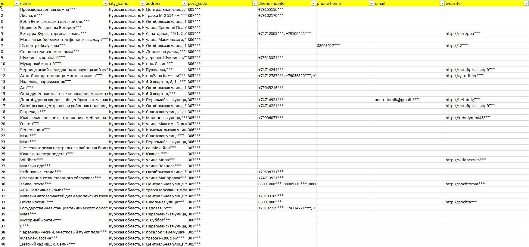 База организаций Курская область, вся Россия в формате Excel с эл. почтами, телефонами, сайтами, ссылками на соц сети, координатами и другой информацией. Скачайте демо версию, чтобы ознакомиться с данными.