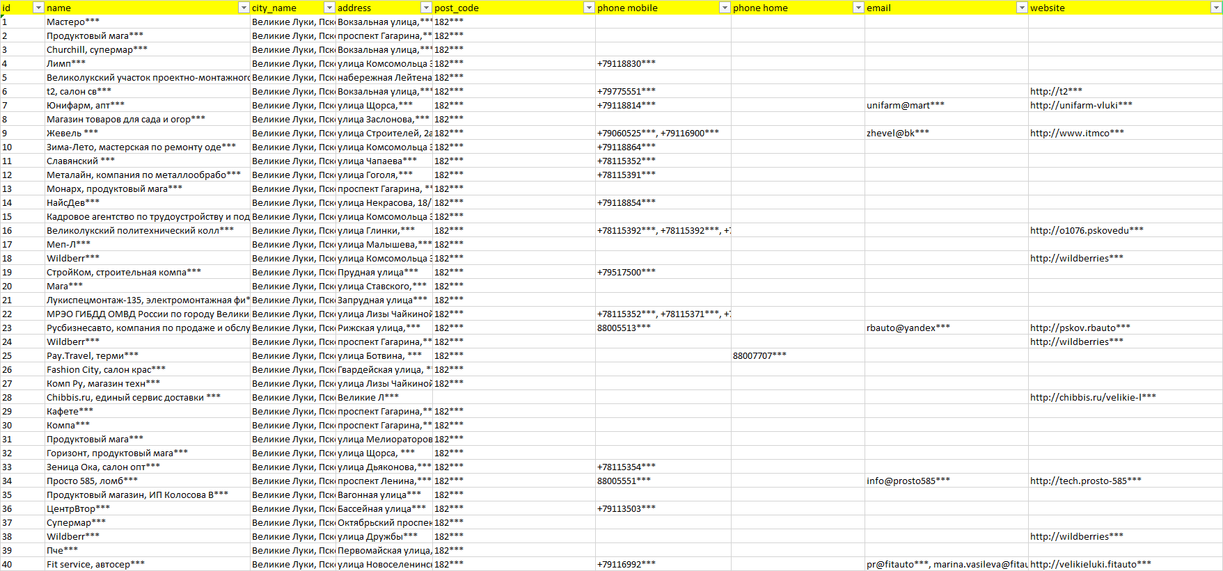 База компаний Великие Луки, вся РФ в формате Excel с эл. почтами, телефонами, сайтами, ссылками на соц сети, координатами и другой информацией. Скачайте демо версию, чтобы ознакомиться с данными.