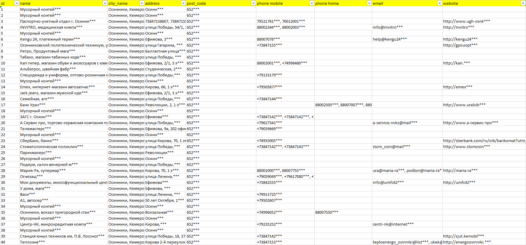 База организаций Осинники, вся Россия в формате Excel с эл. почтами, телефонами, сайтами, ссылками на соц сети, координатами и другой информацией. Скачайте демо версию, чтобы ознакомиться с данными.