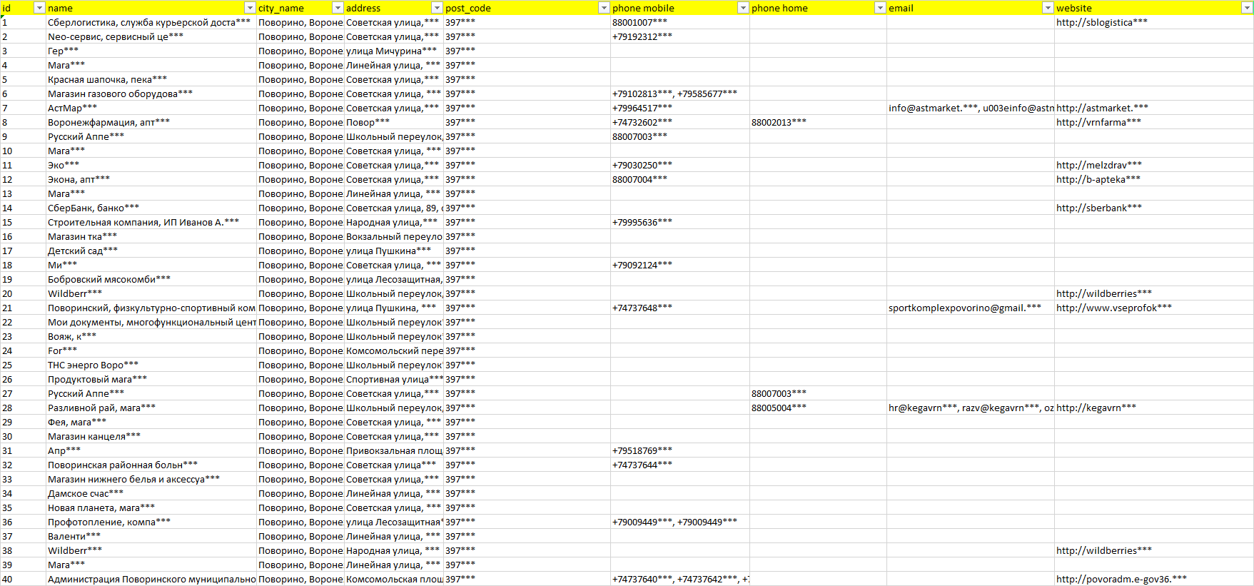 База компаний Поворино, вся РФ в формате Excel с эл. почтами, телефонами, сайтами, ссылками на соц сети, координатами и другой информацией. Скачайте демо версию, чтобы ознакомиться с данными.