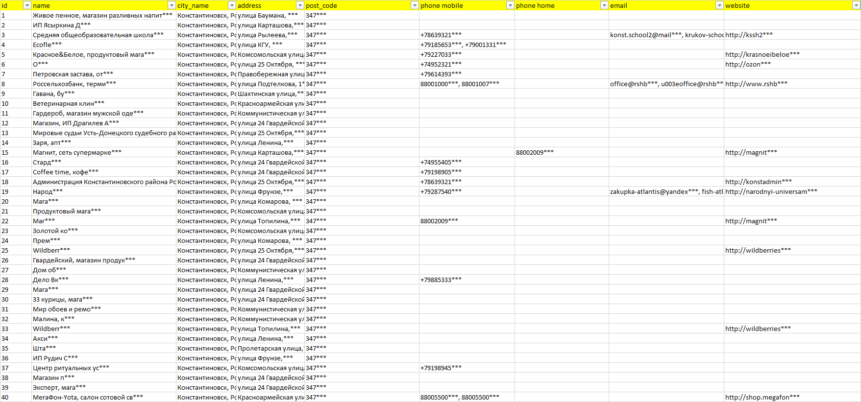 База компаний Константиновск, вся РФ в формате Excel с эл. почтами, телефонами, сайтами, ссылками на соц сети, координатами и другой информацией. Скачайте демо версию, чтобы ознакомиться с данными.
