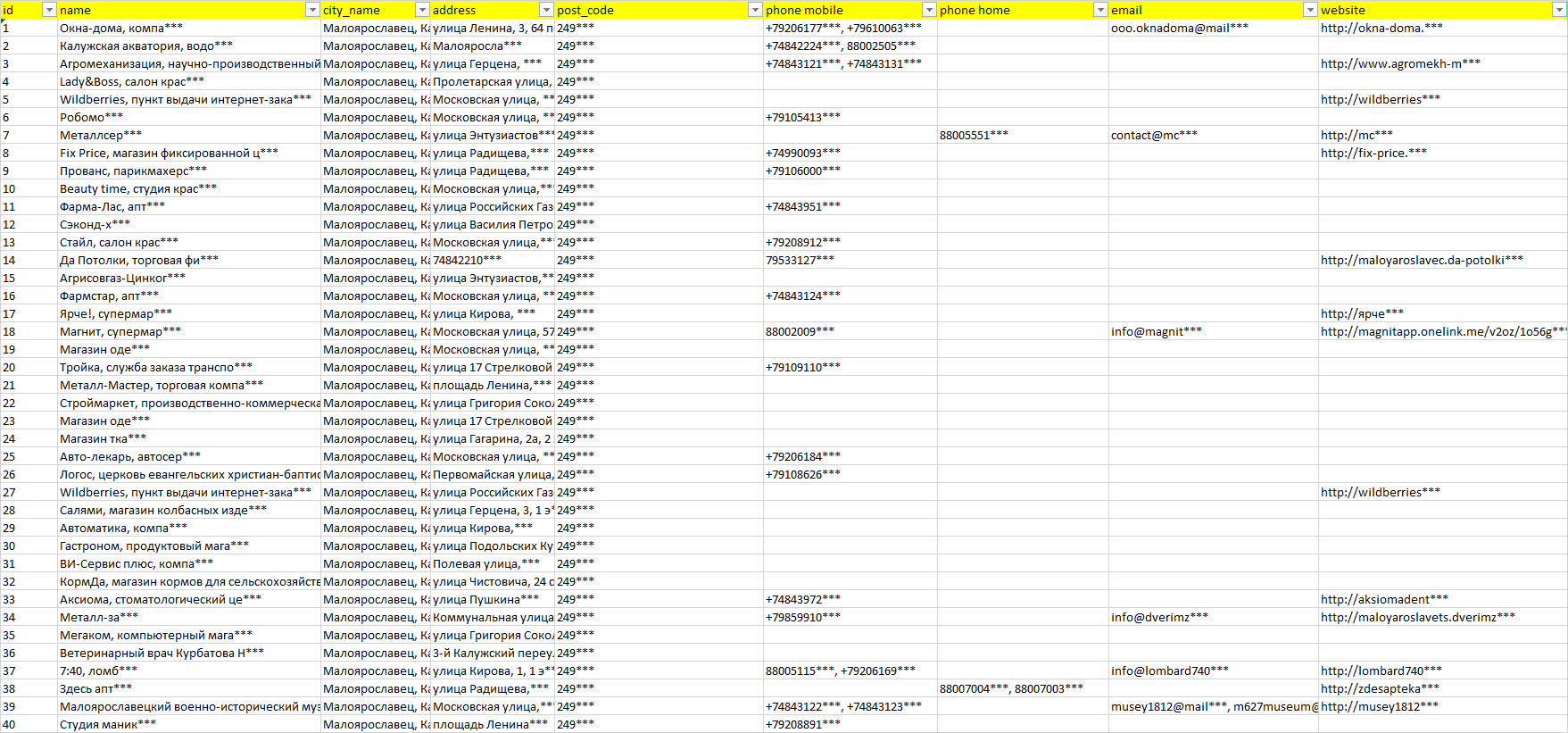 База компаний Малоярославец, вся РФ в формате Excel с эл. почтами, телефонами, сайтами, ссылками на соц сети, координатами и другой информацией. Скачайте демо версию, чтобы ознакомиться с данными.