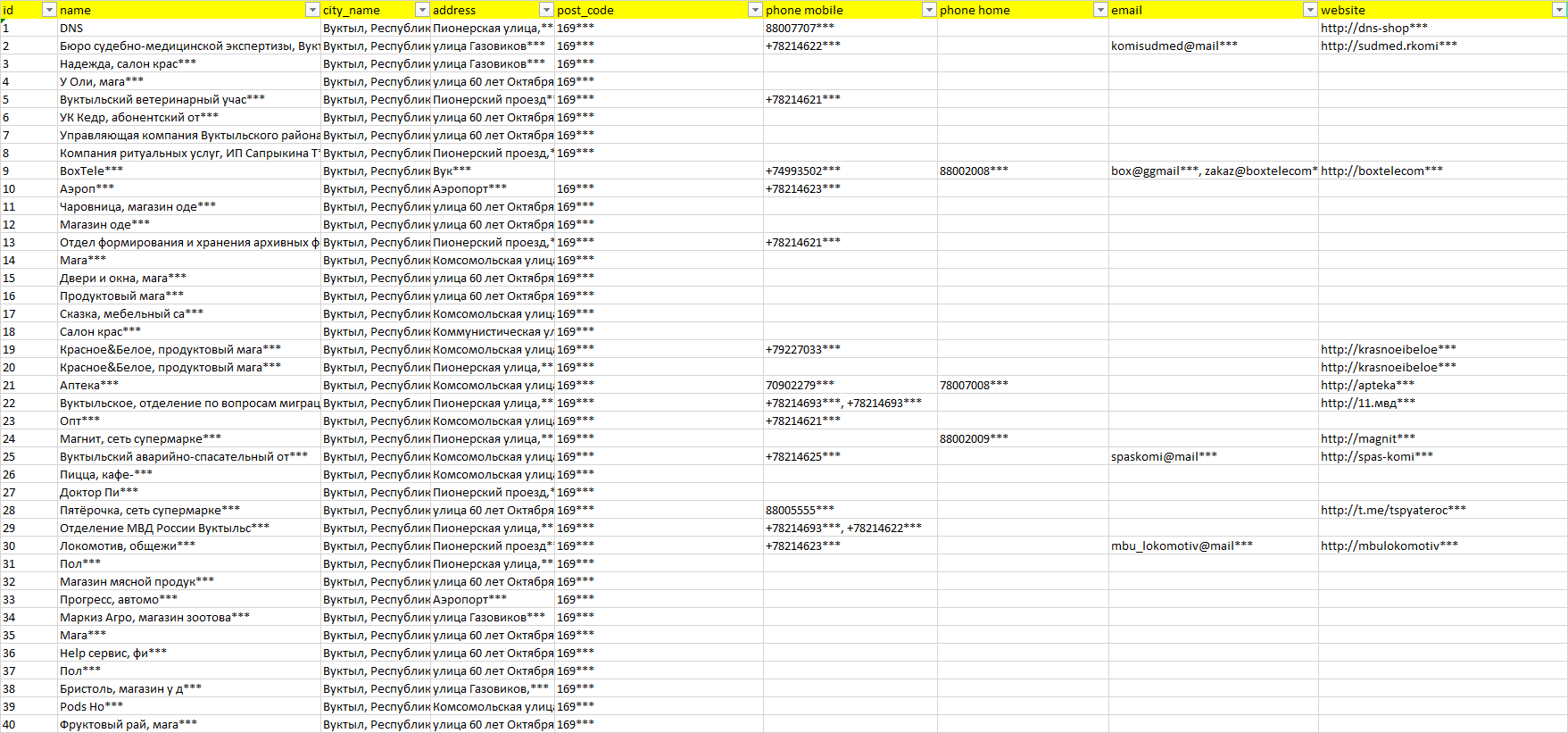 База компаний Вуктыл, вся РФ в формате Excel с эл. почтами, телефонами, сайтами, ссылками на соц сети, координатами и другой информацией. Скачайте демо версию, чтобы ознакомиться с данными.