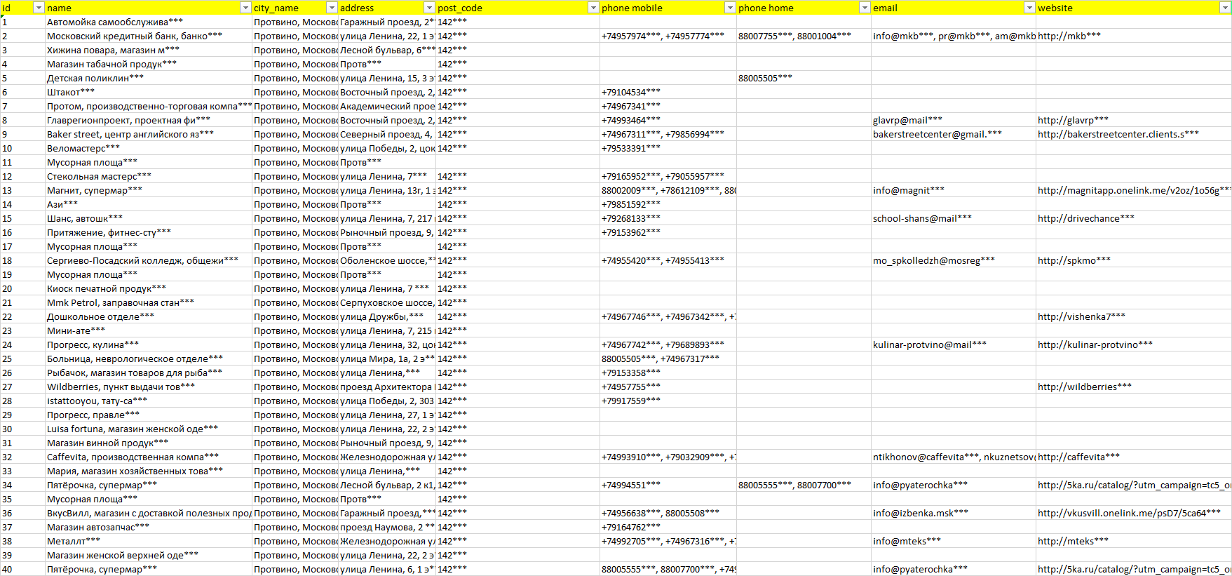 База организаций Протвино, вся Россия в формате Excel с эл. почтами, телефонами, сайтами, ссылками на соц сети, координатами и другой информацией. Скачайте демо версию, чтобы ознакомиться с данными.