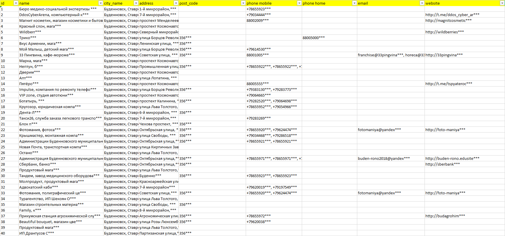 База организаций Буденновск, вся Россия в формате Excel с эл. почтами, телефонами, сайтами, ссылками на соц сети, координатами и другой информацией. Скачайте демо версию, чтобы ознакомиться с данными.