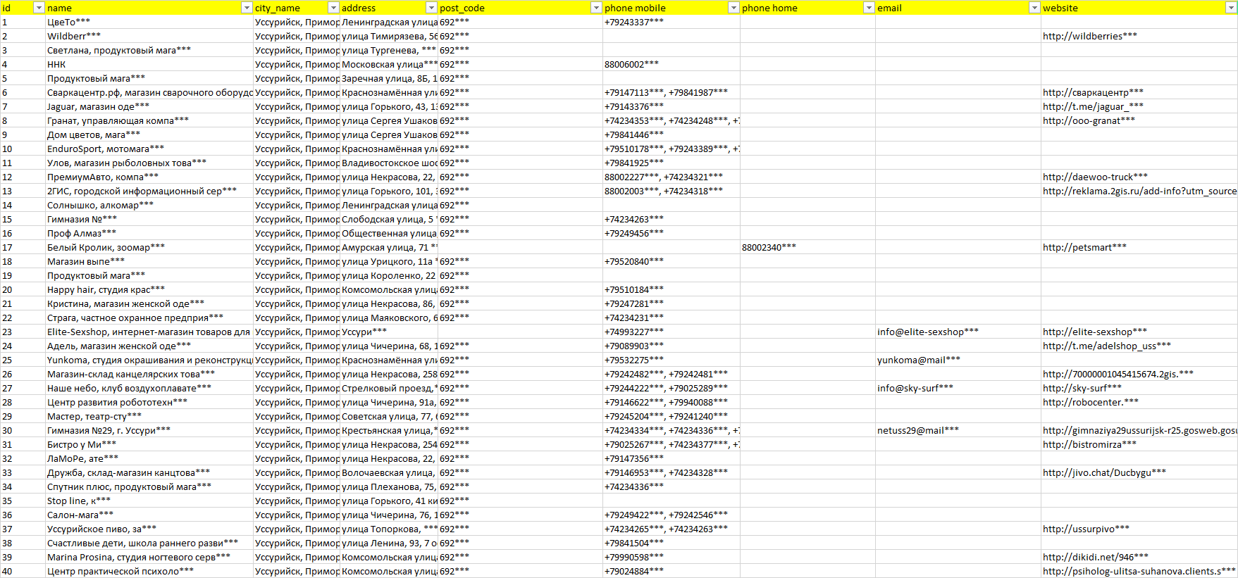 База компаний Уссурийск, вся РФ в формате Excel с эл. почтами, телефонами, сайтами, ссылками на соц сети, координатами и другой информацией. Скачайте демо версию, чтобы ознакомиться с данными.