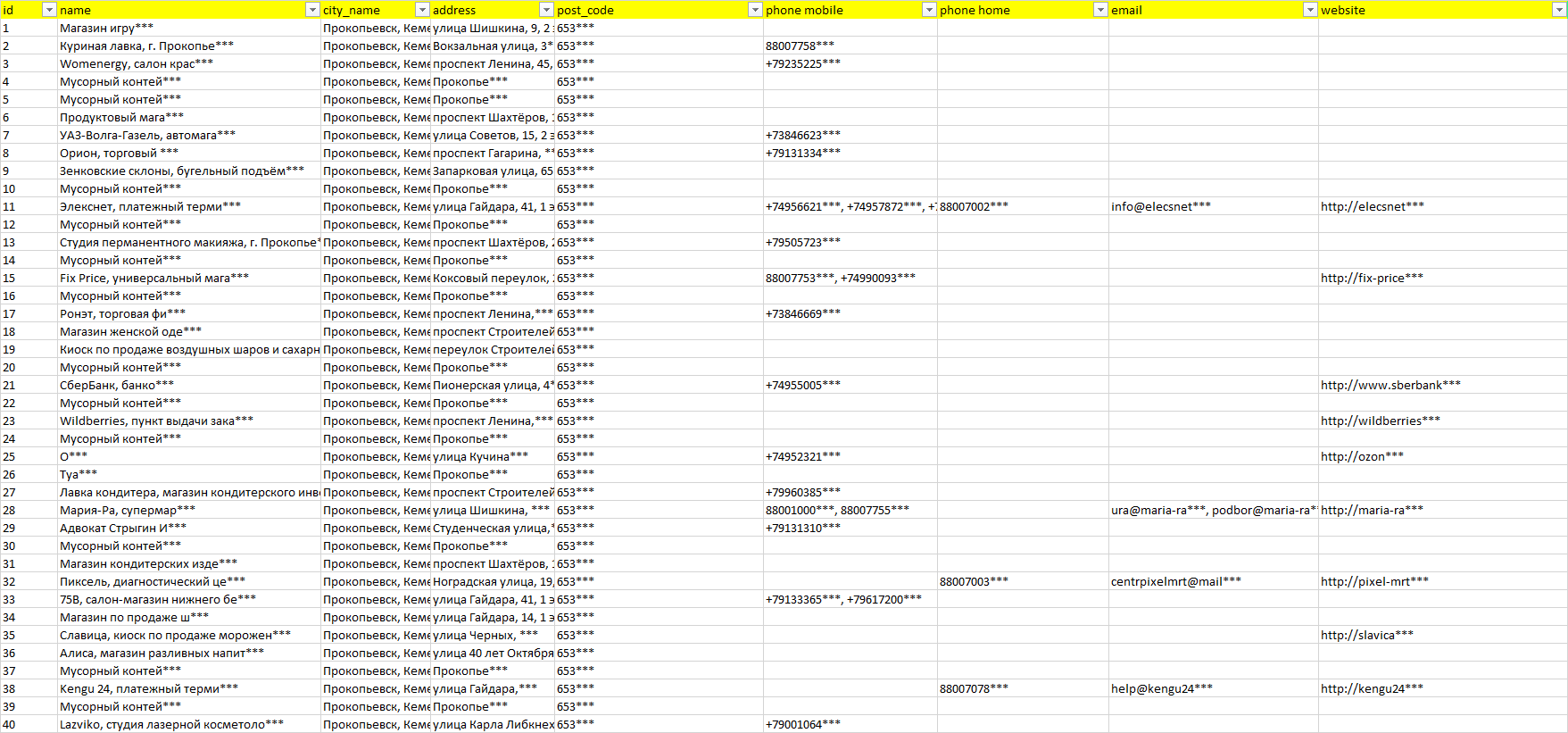 База организаций Прокопьевск, вся Россия в формате Excel с эл. почтами, телефонами, сайтами, ссылками на соц сети, координатами и другой информацией. Скачайте демо версию, чтобы ознакомиться с данными.
