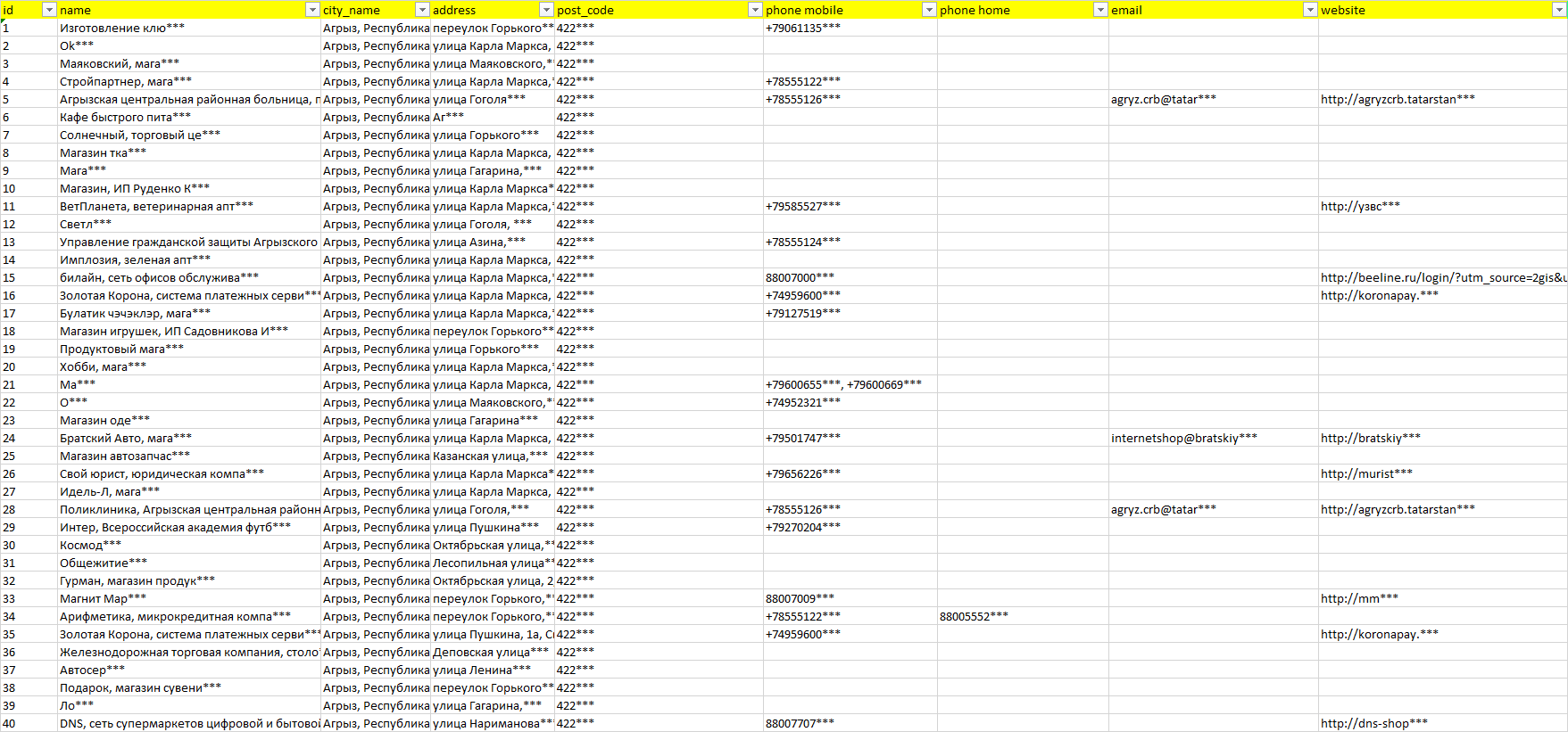 База организаций Агрыз, вся Россия в формате Excel с эл. почтами, телефонами, сайтами, ссылками на соц сети, координатами и другой информацией. Скачайте демо версию, чтобы ознакомиться с данными.