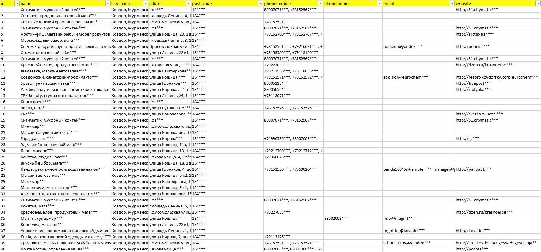 База организаций Ковдор, вся Россия в формате Excel с эл. почтами, телефонами, сайтами, ссылками на соц сети, координатами и другой информацией. Скачайте демо версию, чтобы ознакомиться с данными.