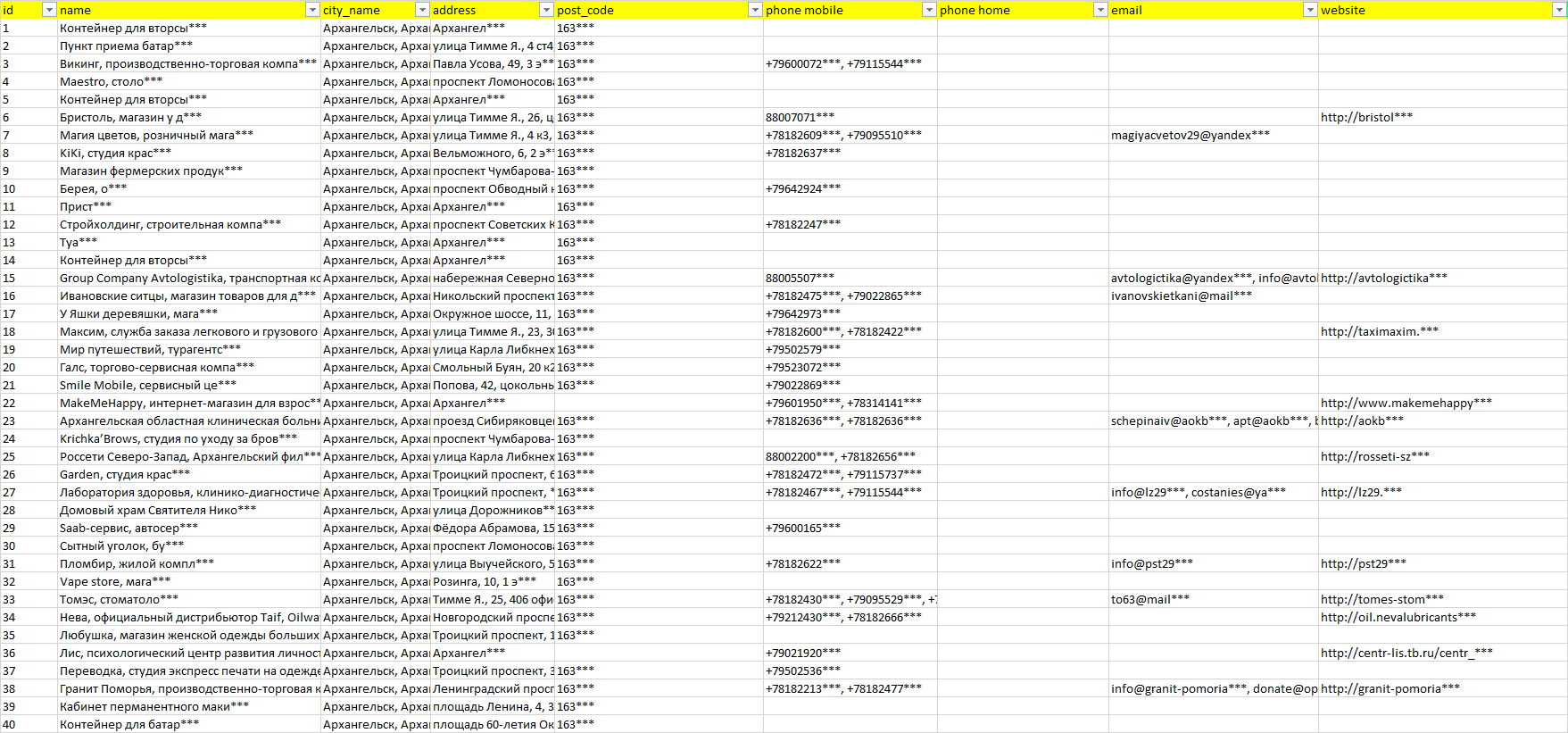База компаний Архангельск, вся РФ в формате Excel с эл. почтами, телефонами, сайтами, ссылками на соц сети, координатами и другой информацией. Скачайте демо версию, чтобы ознакомиться с данными.