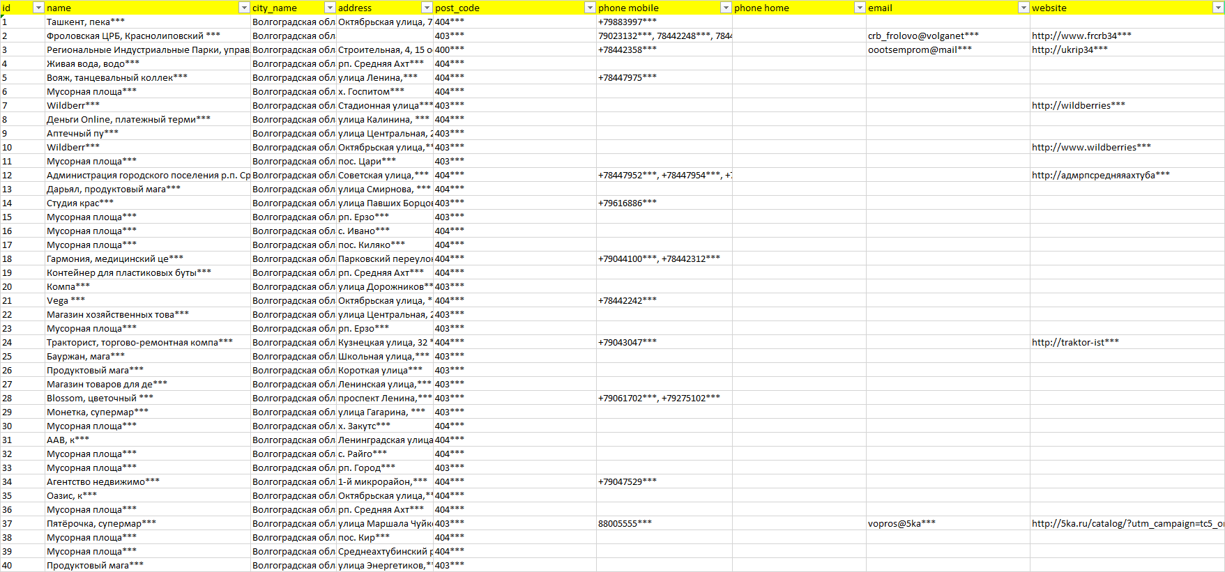 База организаций Волгоградская область, вся Россия в формате Excel с эл. почтами, телефонами, сайтами, ссылками на соц сети, координатами и другой информацией. Скачайте демо версию, чтобы ознакомиться с данными.