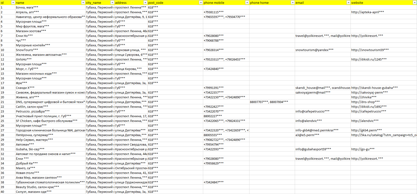 База организаций Губаха, вся Россия в формате Excel с эл. почтами, телефонами, сайтами, ссылками на соц сети, координатами и другой информацией. Скачайте демо версию, чтобы ознакомиться с данными.