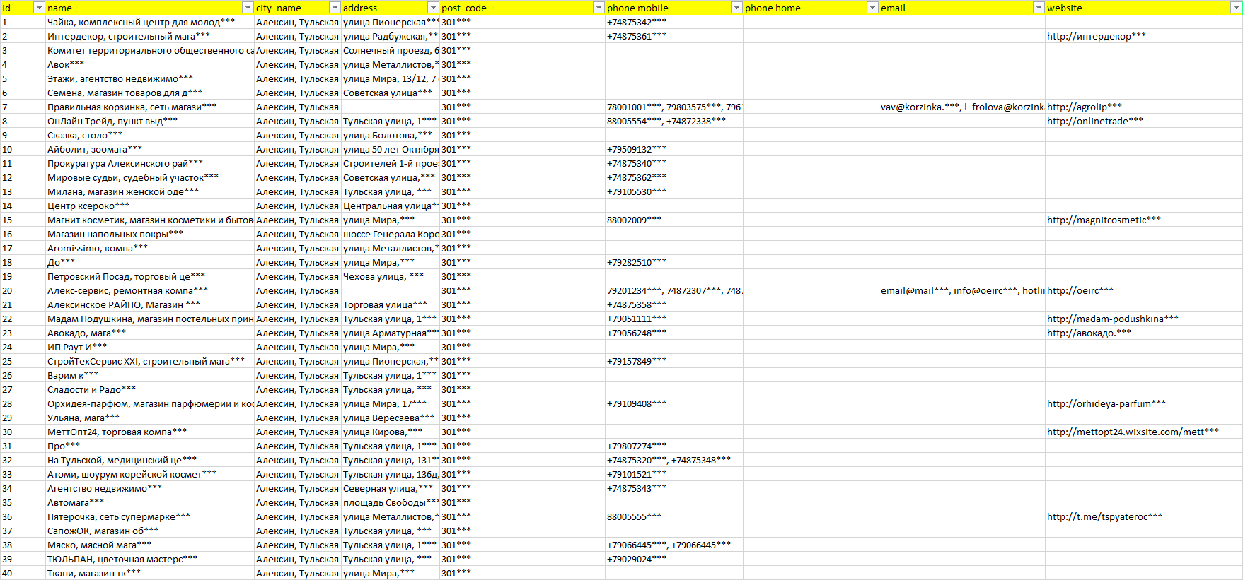 База компаний Алексин, вся РФ в формате Excel с эл. почтами, телефонами, сайтами, ссылками на соц сети, координатами и другой информацией. Скачайте демо версию, чтобы ознакомиться с данными.